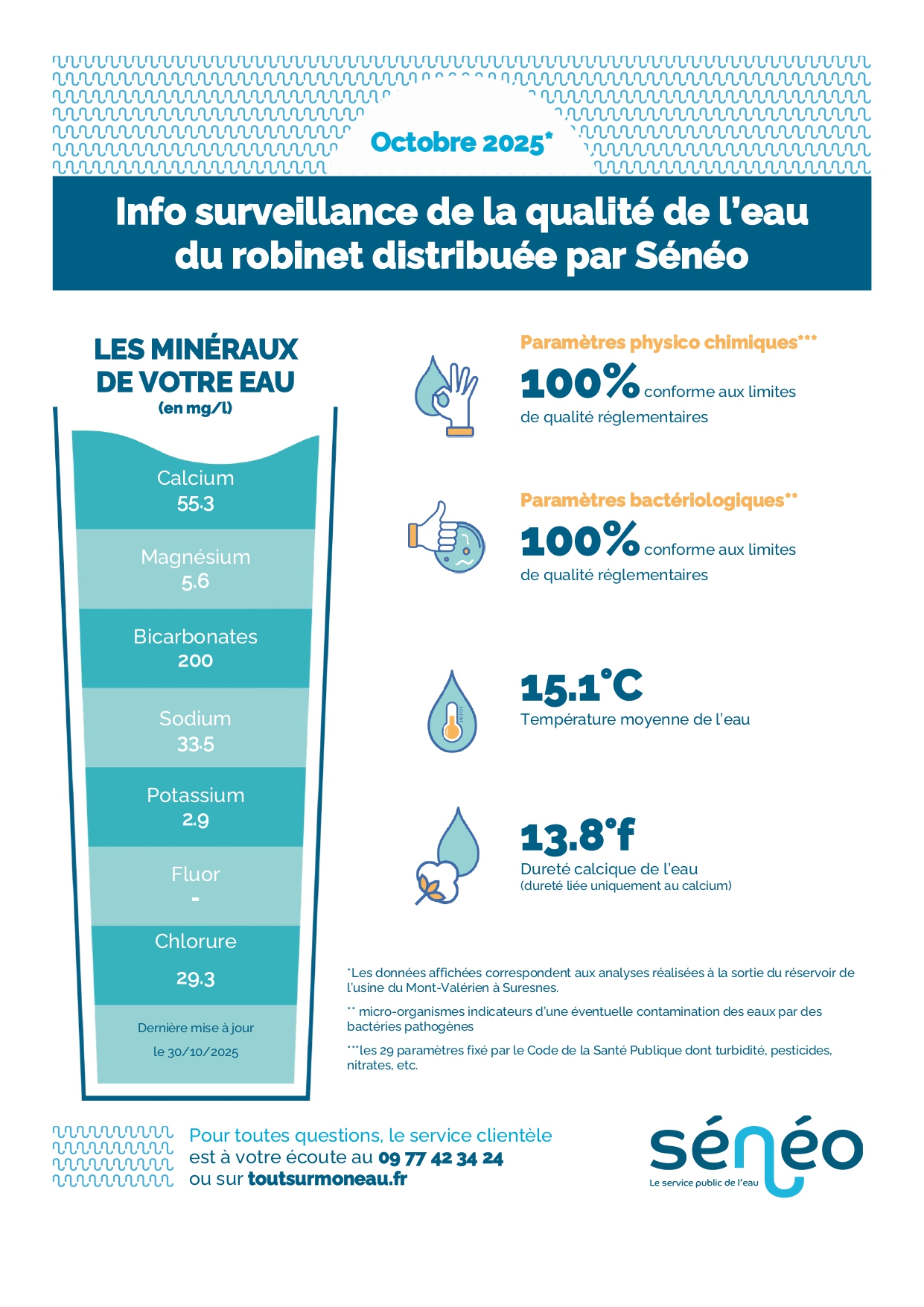 Sénéo, le fournisseur d’eau desservant 610 000 habitants répartis dans 10 communes, se préoccupe grandement de la qualité de l’eau potable mise à disposition de ses usagers. Chaque mois, l’entreprise publie une info-surveillance détaillée, offrant un aperçu complet des caractéristiques de l’eau du robinet, comprenant minéralité, dureté, température ainsi que les paramètres physico-chimiques et bactériologiques.